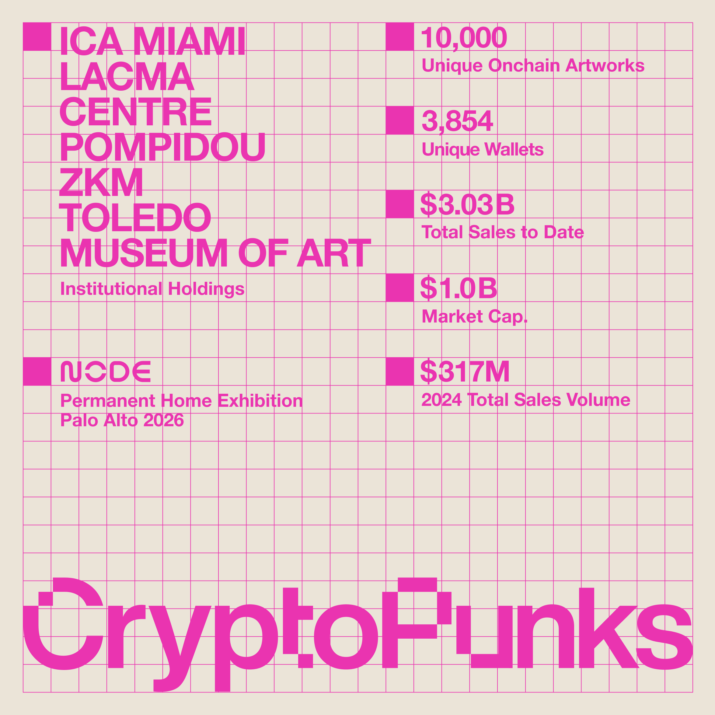 Punks deserve a physical space that honors their significance. NODE is working to showcase the collection as evolving onchain culture, not traditional static artifacts. Under our stewardship, CryptoPunks will remain as the artists intended, while continuing to stand as the landmark collection of this century's defining art movement.
